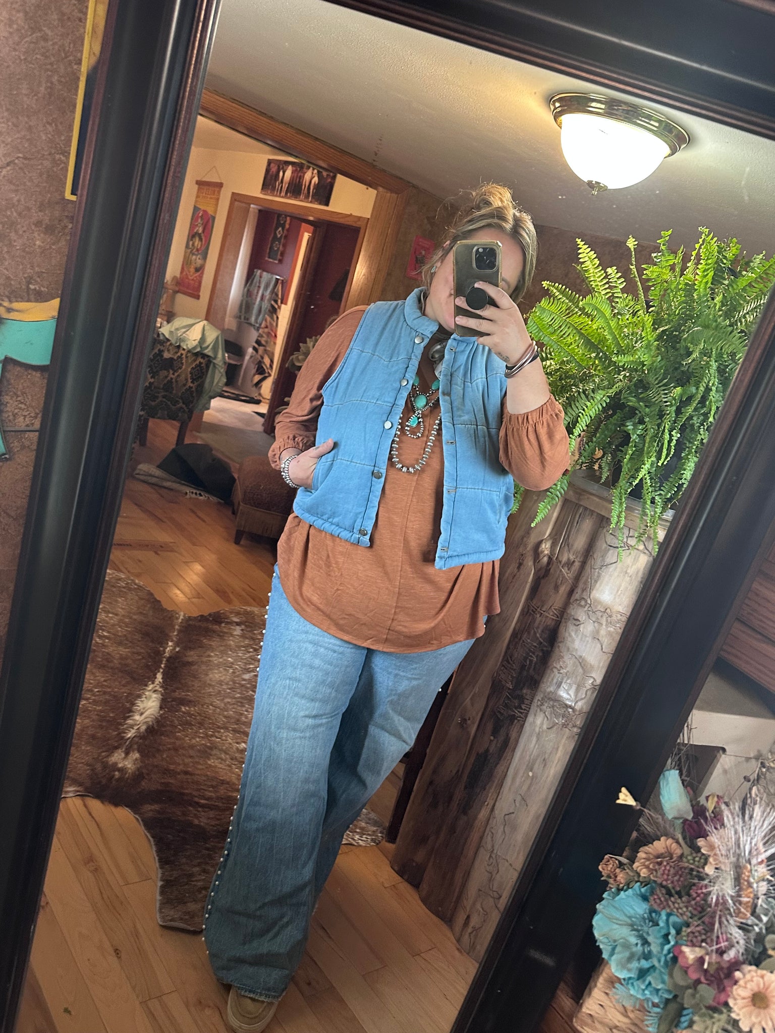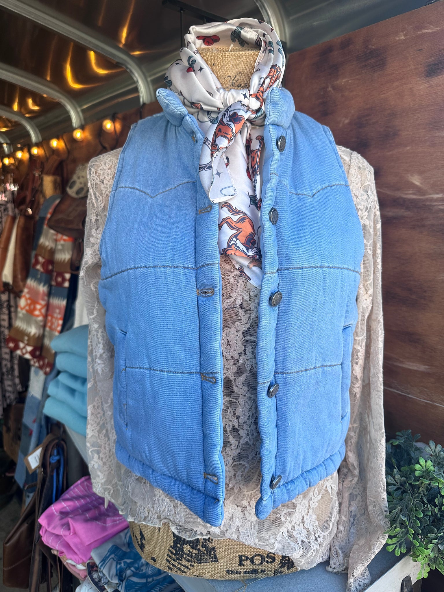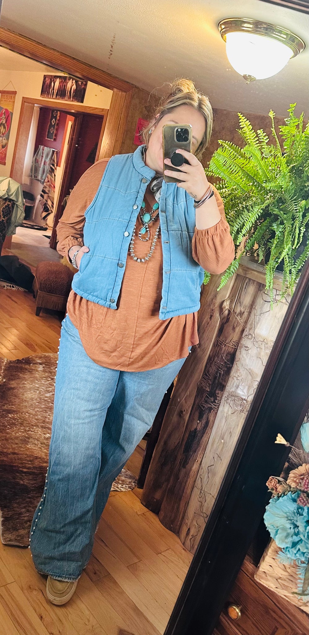Super soft denim fabric, runs small, so I suggest ordering a size up if you want a little more length. cropped fit!