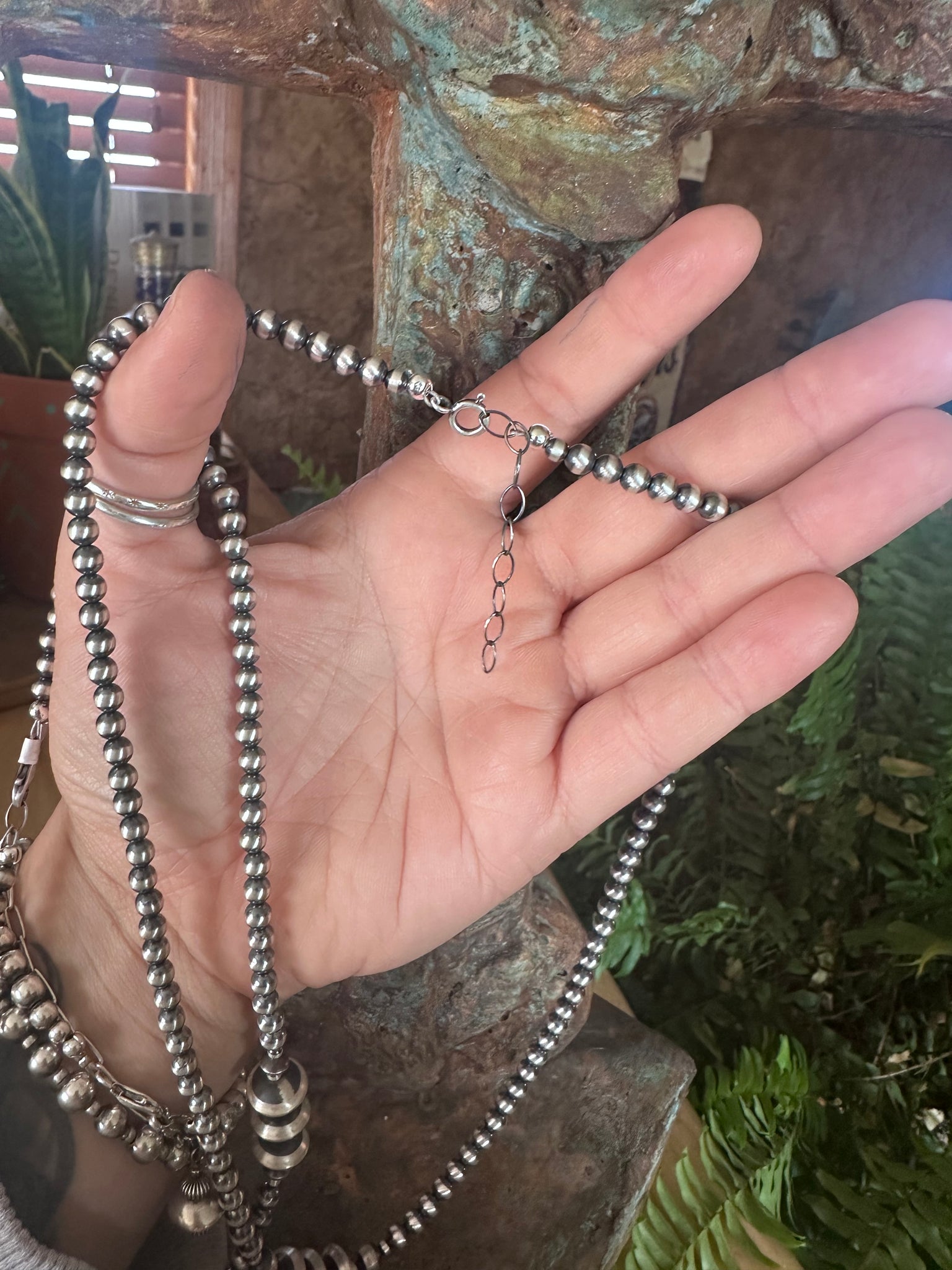 5mm sterling silver Navajo pearl beads, leading down to three handmade saucer beads